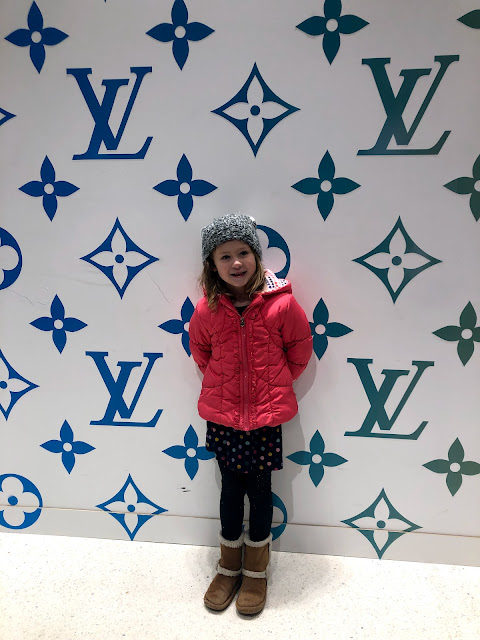 I spotted this wall and put Eliza in front of it! We felt all “Midwest” walking in a mall with Louis Vuitton, Tom Ford makeup stylists and a DJ in the makeup/shoe department! I would have looooved to get my makeup done, Jon was all about me doing it – but I knew the kids would be bored so I just kept walking! So fun though!!!