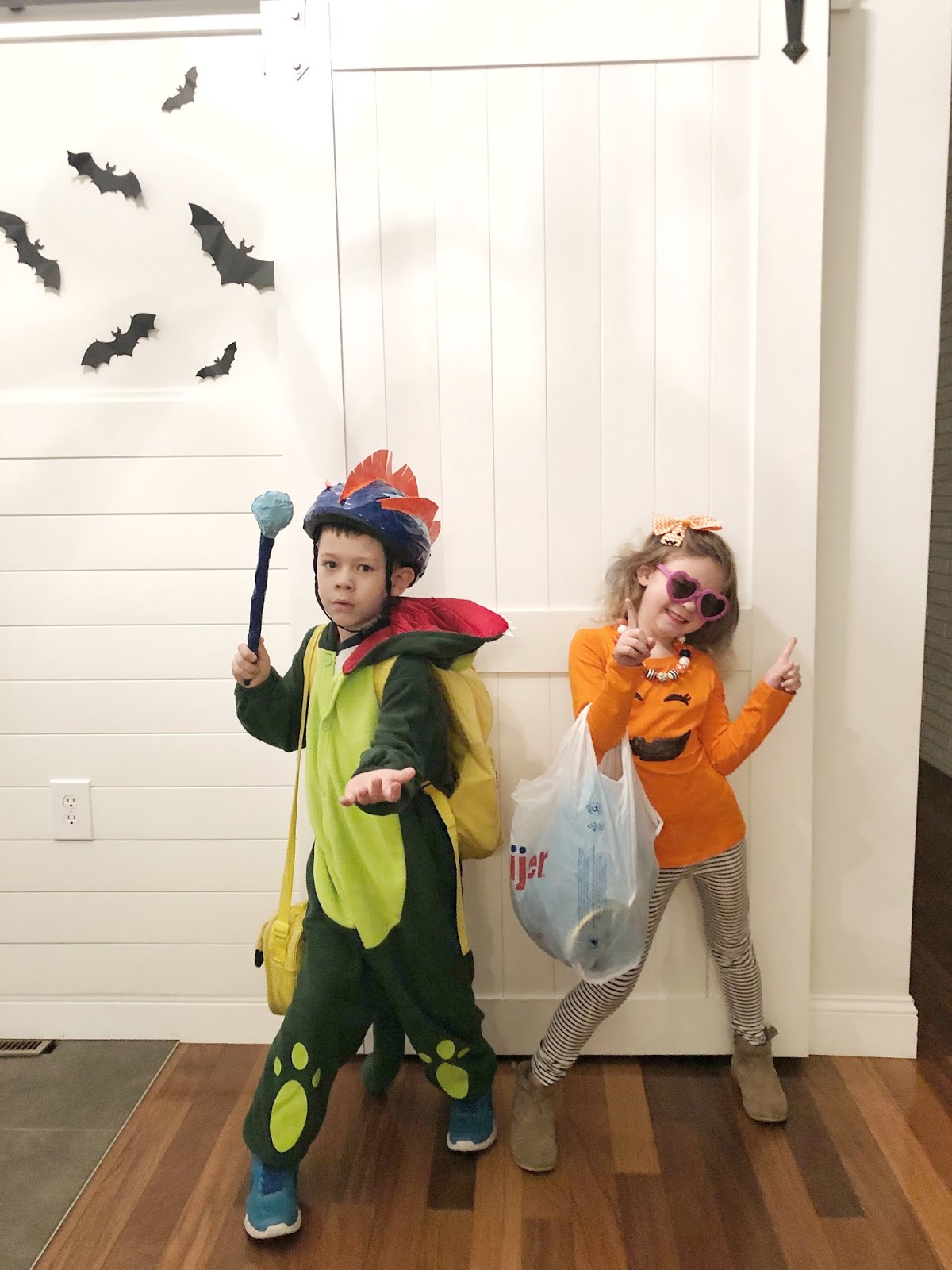 We rushed home after school pick up, I hurried and warmed up some chili for the kids (they needed some actual healthy food in their bellies before more candy was consumed), I put a little bit of makeup on Eliza and reapplied her beloved red lipstick, we turned on the pumpkin lights and headed off with the neighbor boys to do some trick-or-treating!
