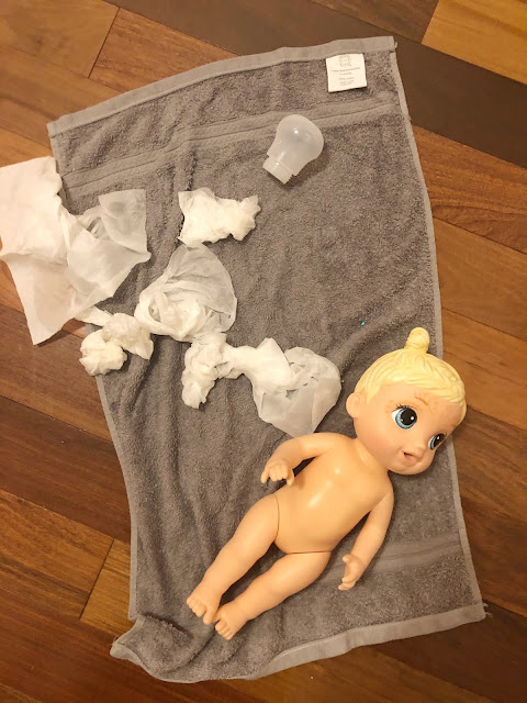 She had her doll bathtub filled with a little bit of water and I found that she had been bathing her babydoll. Not only that, but she put out a couple of sweet outfits, too.