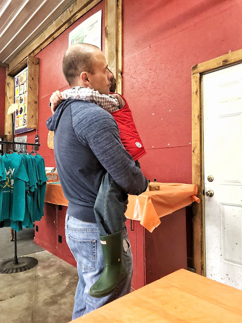 We usually wait to have doughnuts and cider until we’re done visiting the farm, but Jon was trying to fight off a headache (he’s been really busy lately and I think the headache was a direct result of his busyness) so we decided to sit for a bit and carb load on doughnuts and cider.