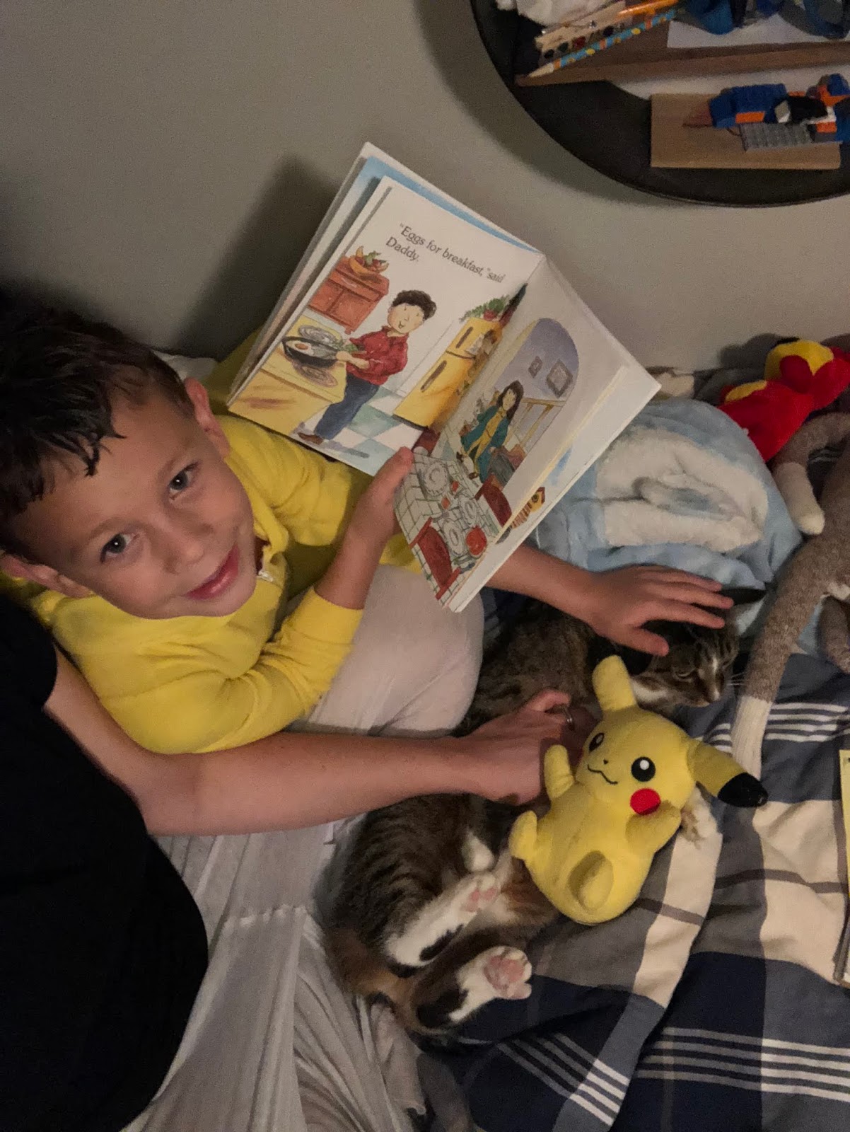 Henry’s homework has been to read throughout the week. This particular picture is of him reading to Nubs and all of his stuffed animals. Henry thought it was hilarious that Nubs had to “listen” to him read. We had to pick a quick book because there was no way Nubs was going to stay for long… 😉