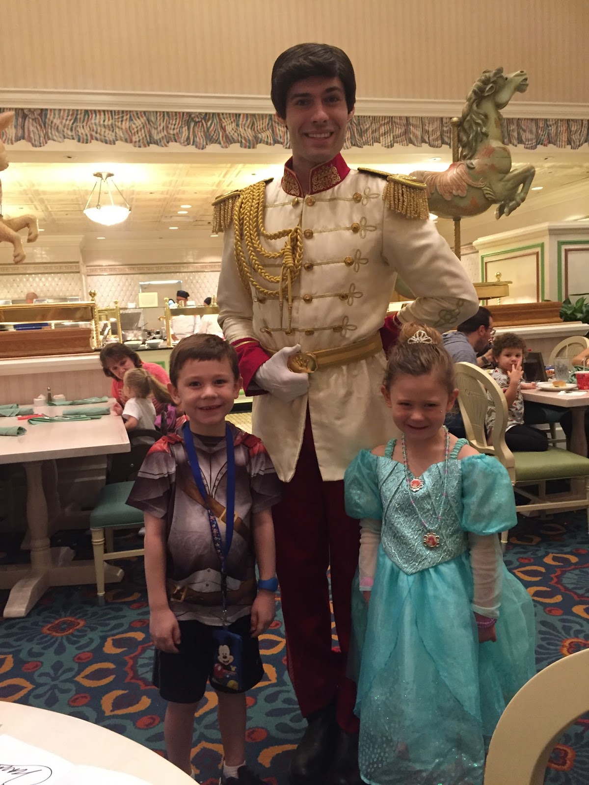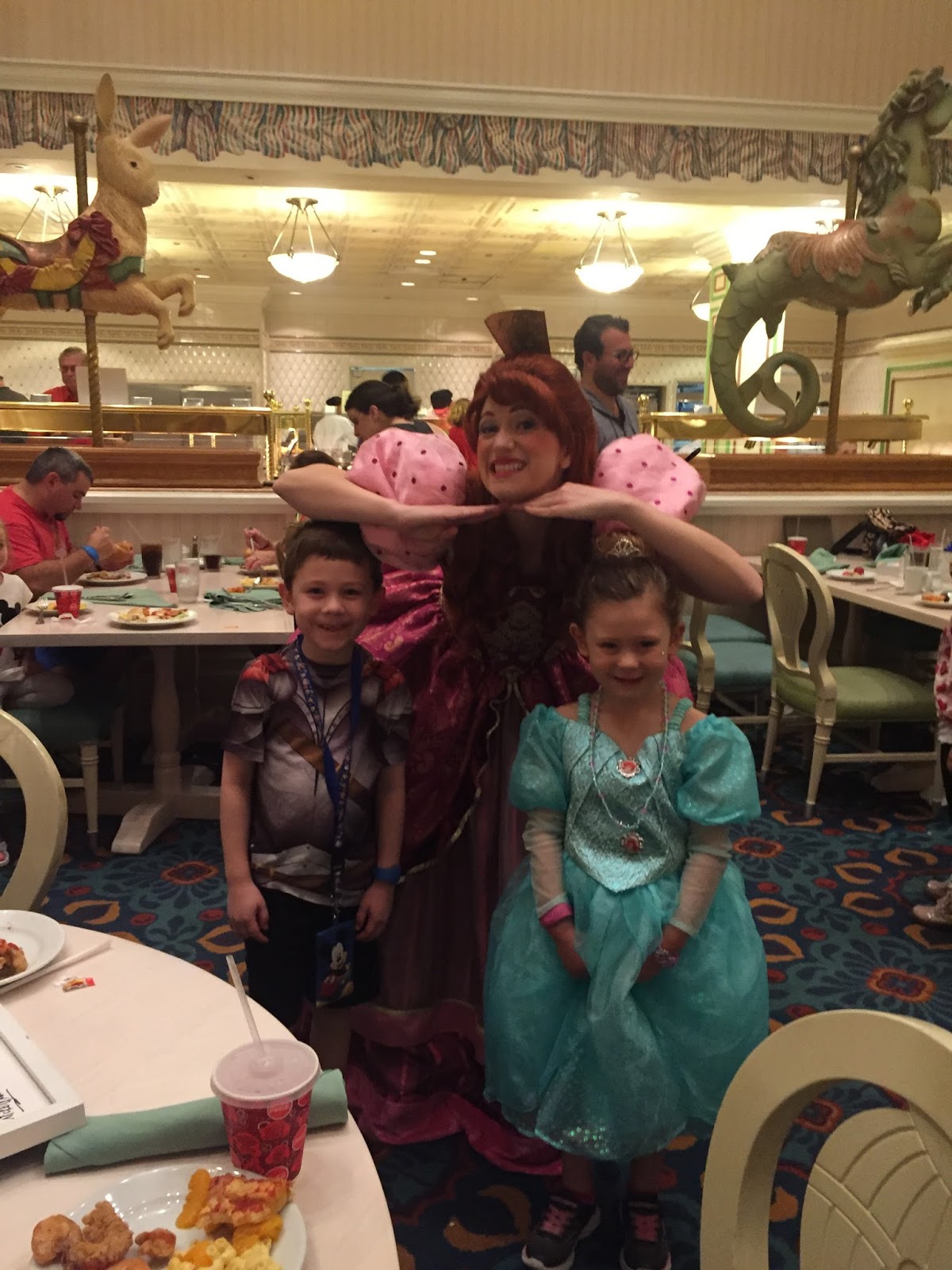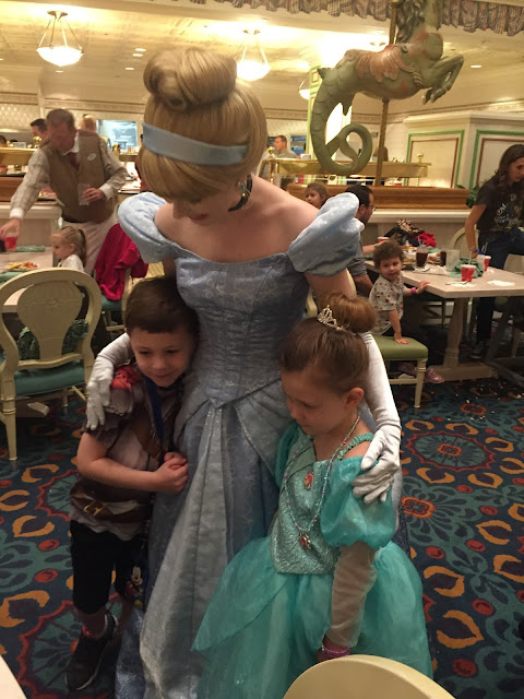 As we were waiting, I helped transform Eliza into her outfit (hair and all) from the day before when we had visited the Bibbidi Bobbidi Boutique. We brought Henry’s knight shirt along, too. By the way, this is my favorite character dinner and my favorite buffet! We’ve been here twice and both times have been delicious and hilarious!