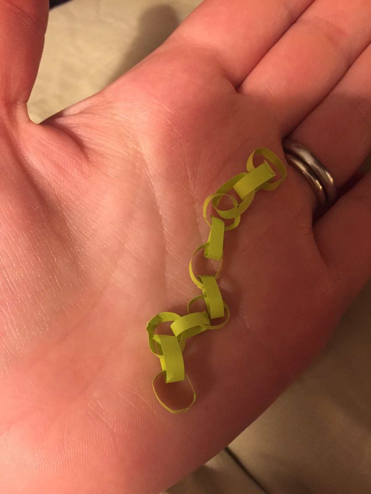 Elmer showed up on Christmas Eve at the in-laws and rumor has it, my MIL helped make this tiny little chain link with tweezers for Elmer’s tree.