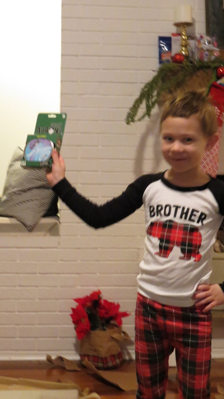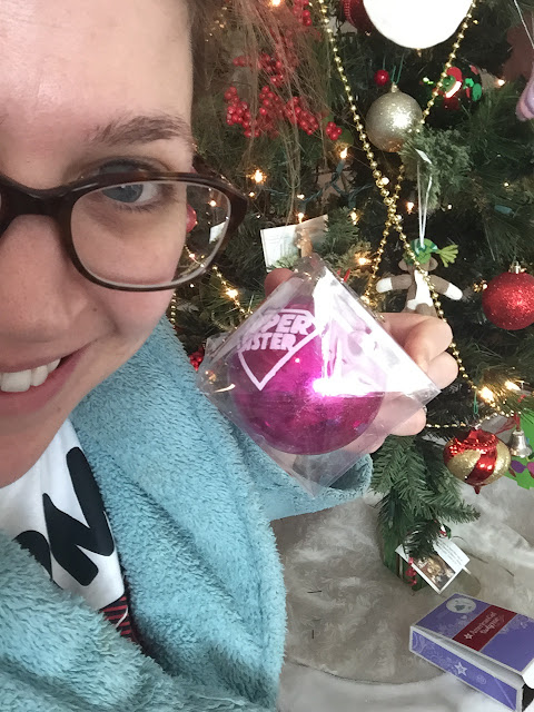 I opened my present from Henry. It’s a Christmas bulb that says, “Super Sister.”