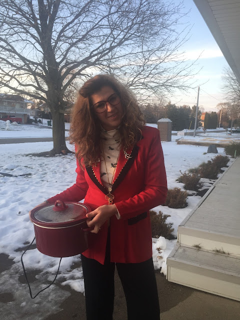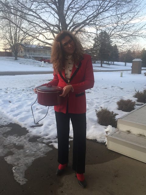We attended a holiday party with a bunch of our friends. I thought it’d be fun to wear an ugly sweater, but then I found this spectacular pant suit at Goodwill and couldn’t resist the fanciness of it all. Of course, I had to find some large glasses to match (I popped out the lenses of some cheap sunglasses). My hair was a must, the turtle neck was on fleek and the brotches are owned by yours truly. Classy and sassy, I know…