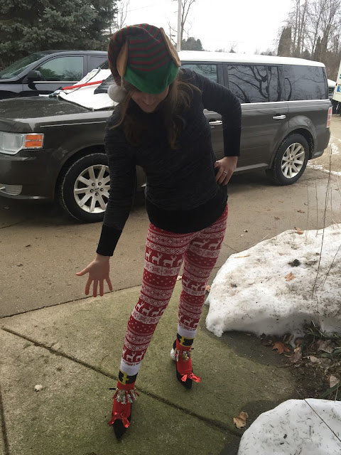 I was sporting some sweet high heels that Jon received as a white elephant gift from the Christmas friend party.