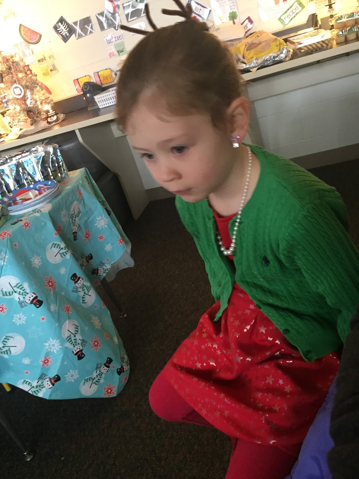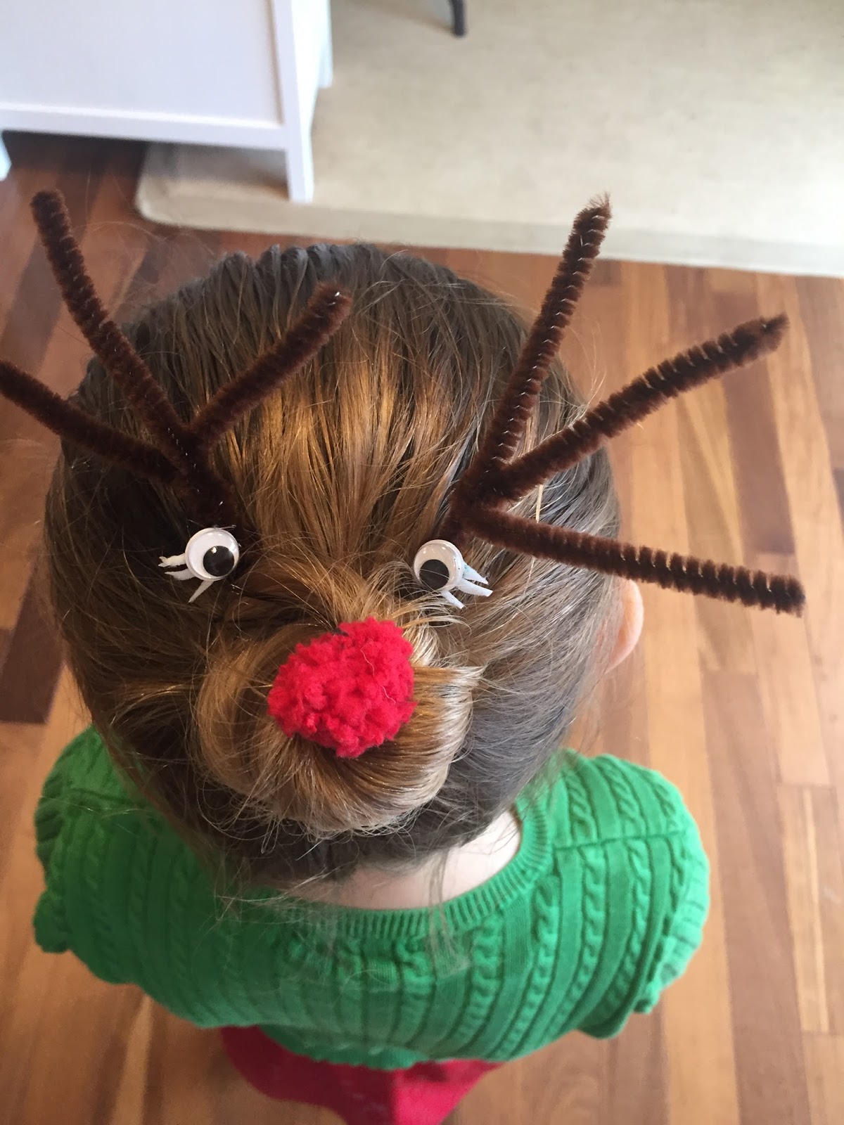 I dropped off Henry at school and Eliza and I ran a few errands before heading to the party at 10:30. I tried to squeeze in all-things-everything with any time I had the week leading up to Christmas. For the few moments I had to breathe on this particular day, Eliza decided she wanted a reindeer in her hair. I somehow magically had all the reindeer hair accessories and necessities on hand for another project I was about to do later that evening. This is what we ended up with…