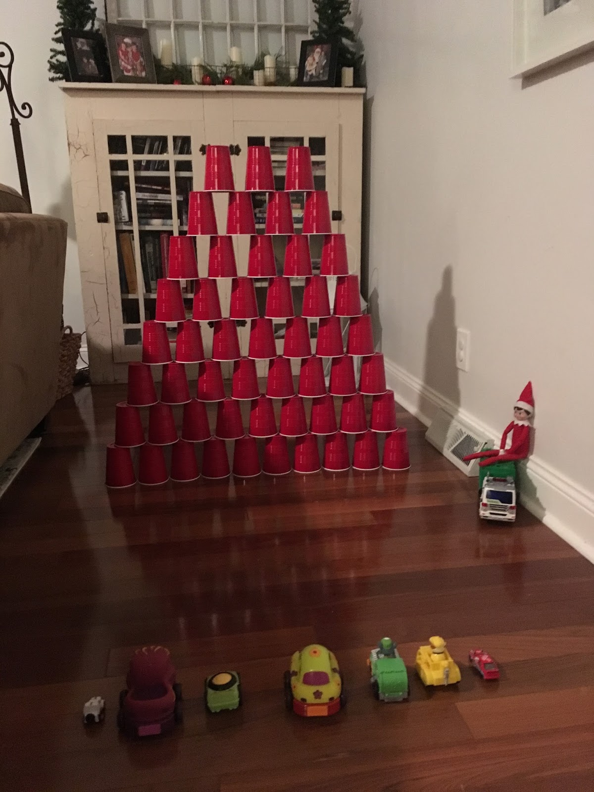 Eliza and I came home and she took it upon herself to make shoes (and a mess) out of all of those Solo Cups Elmer had left for us. I mean, the shoes DO match the outfit…