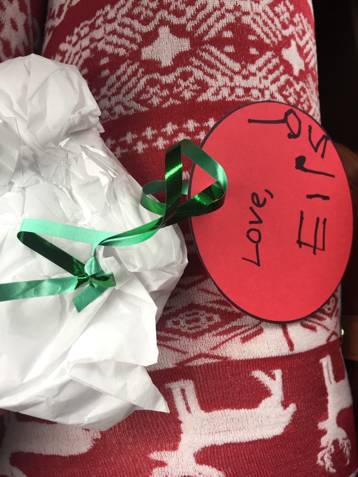 Eliza’s gift to me. It was an adorable ornament, but I also kept the tag and hung it up on the tree.