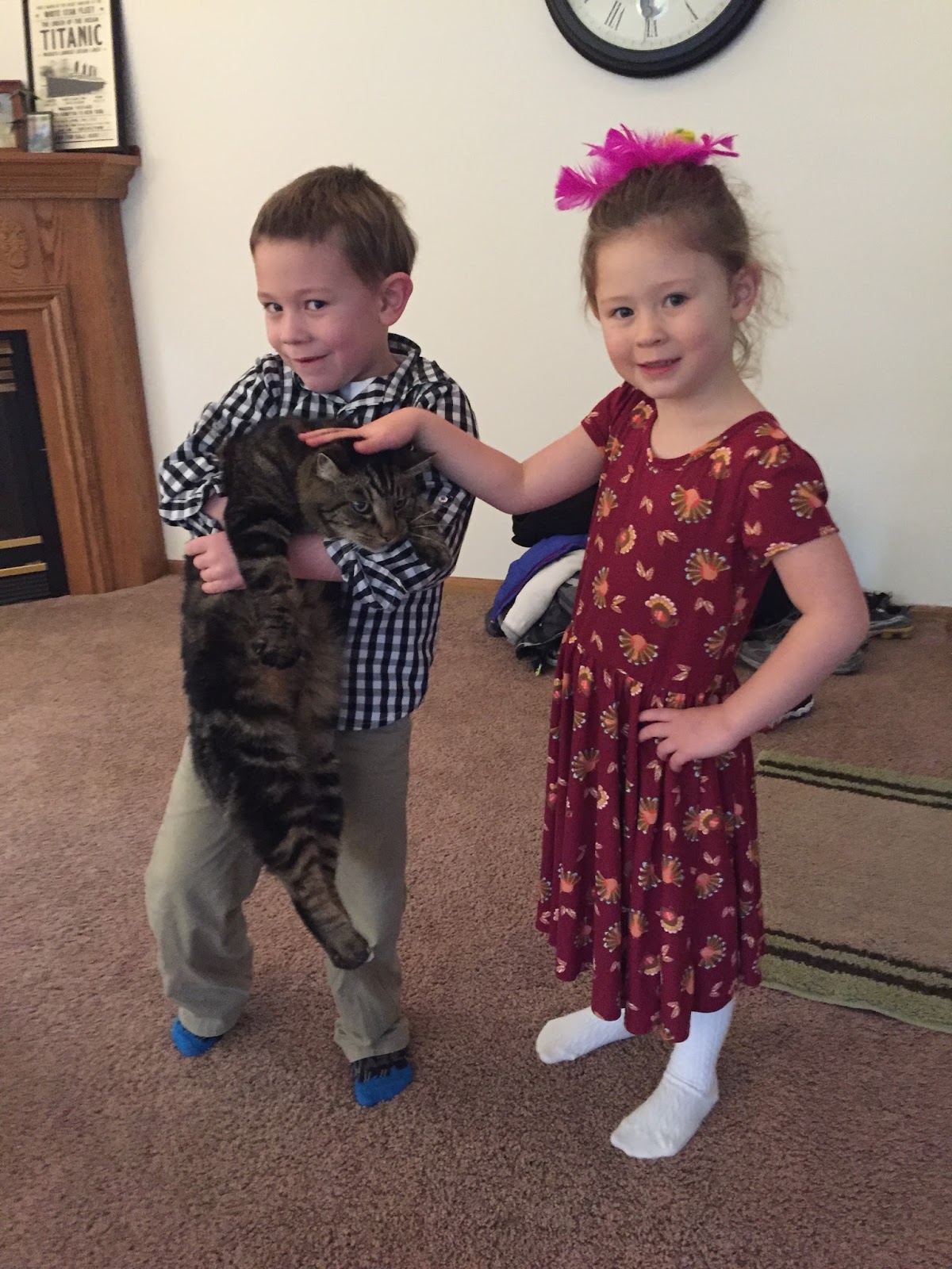 We went to the grocery store, picked up the pipe cleaners and feathers and then, on Wednesday, we happened to throw this cute turkey together in about five minutes or so before running out the door for school.