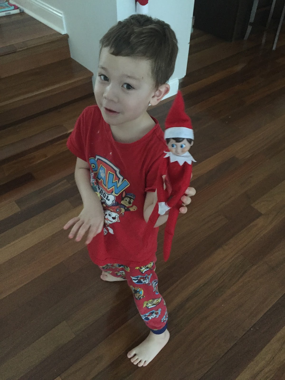 Our Christmas Elves had arrived and our Christmas Eve pajamas were left out on the front porch and wouldn’t you know it – as we were opening our packages, Elmer disappeared.