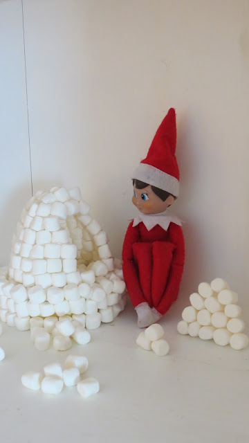 The toys and Elmer get along great now! So much so that one day last year Elmer was able to partake in a friendly snowball fight with his friend, Elsa! Good thing he made that mini marshmallow igloo (glued together with hot glue) for snowball (marshmallow) protection!