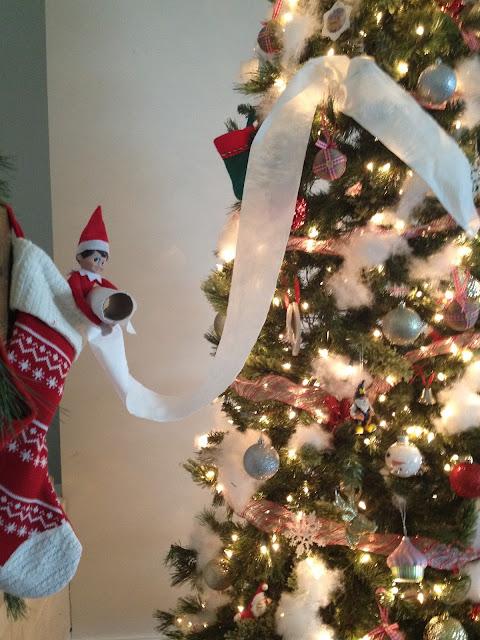 Let me tell ya’, it really seems as though Elmer enjoys TPing our house…quite a bit, in fact. I’m guessing it’s because the kids think it’s hilarious and probably because it’s so stinkin’ easy to do. 😉 But who knows why he does what he does, I mean, I’m no elf. 😉