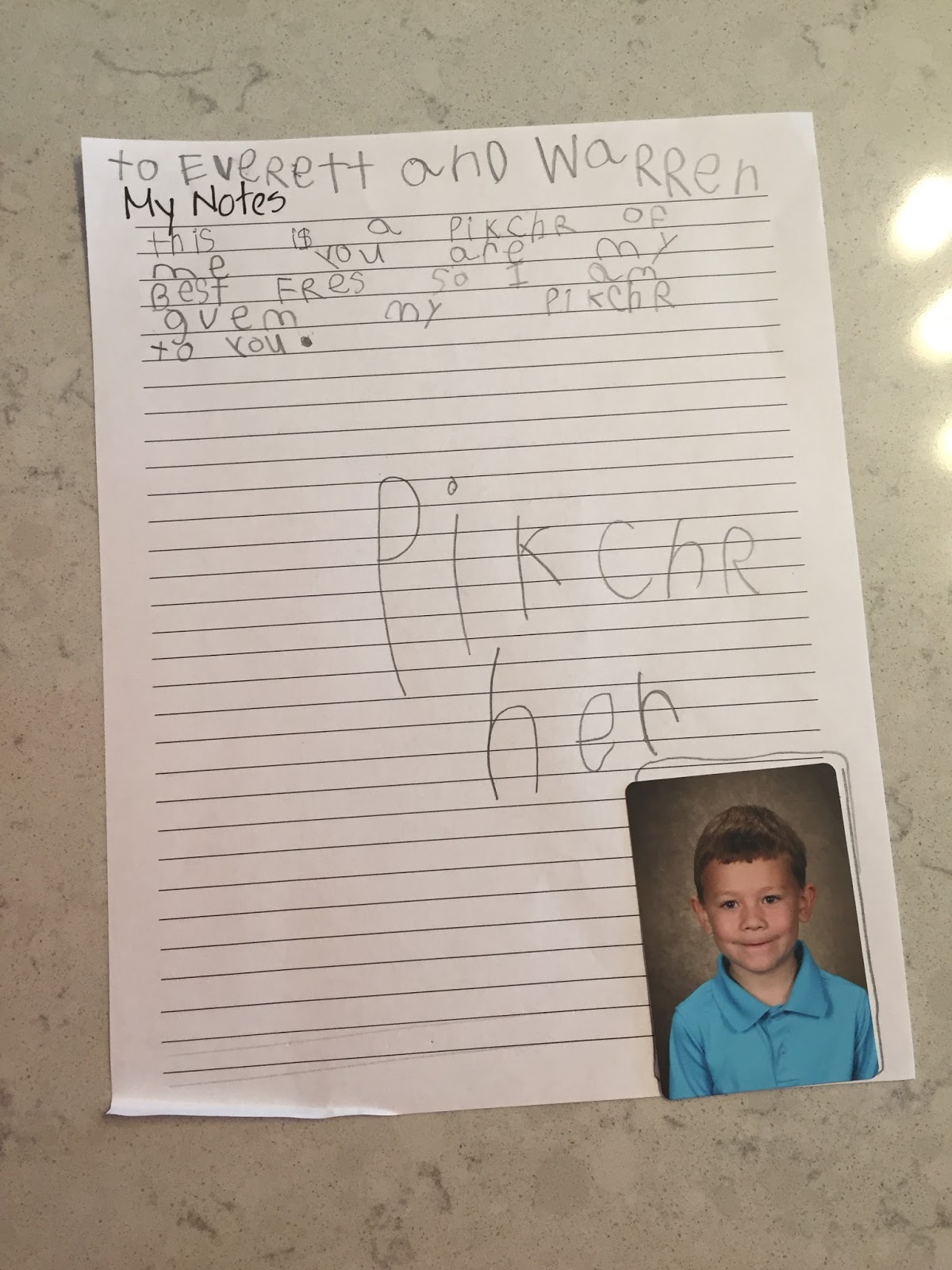 I ended up buying the CD of Henry’s school pictures and I found that the CD included stationary with his picture on it. Although, the paper you see below has his actual printed off photograph lying over the picture on the stationary. This kid has loved printing off his school picture stationary and writing out notes and stories!