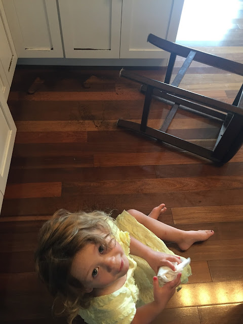 That sweet little babe of mine then attempted to help clean up all the grounds with water and paper towel which only made the mess worse. Oh and don’t ask me what happened to the stool within those 37 seconds? She didn’t fall. Honestly, I have no idea what happened here.
