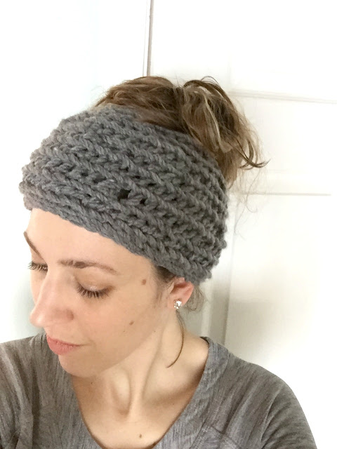 About a month ago I came across a really cute hat on Facebook or Instagram, I really wish I could remember where I saw it. Well, there’s a spot for your bun or your ponytail to come out of the back/top of the hat and it covers more of your head than the typical winter headband. I was all, “I need this in my life.” I asked my sister if she could whip one up for me (as she knows how to crochet and I have not a clue on how to even begin).