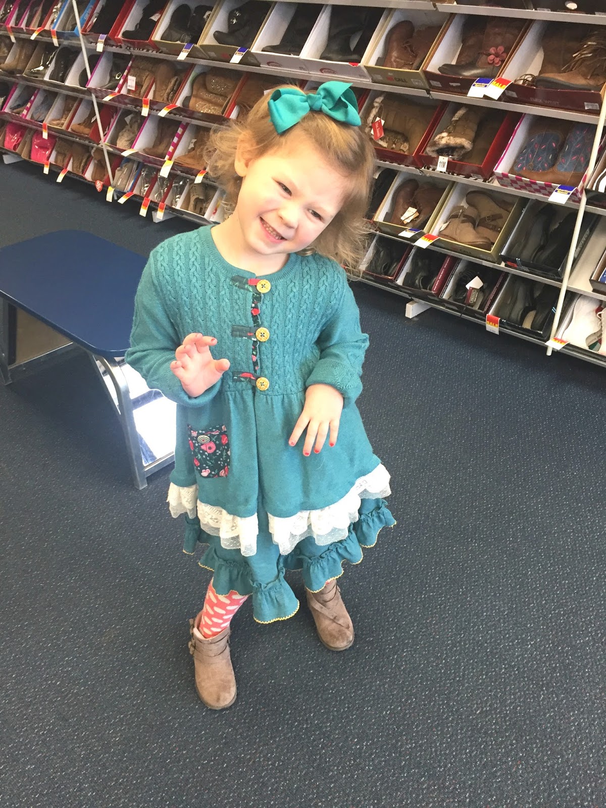 It’s been pretty darn cold here in Michigan lately, so we haven’t been venturing outside much, well, other than driving the kids to and from their schools. However on Tuesday, while getting Eliza ready to leave for preschool, she put on her cute boots (seen below) only to find out that they were way too small. How did that happen?! We had no other shoe options so I told her to wear these ones one last time and I had promised her that after school we’d go shoe shopping. We basically bought the same shoes except a couple sizes bigger and with a darker colored strap.