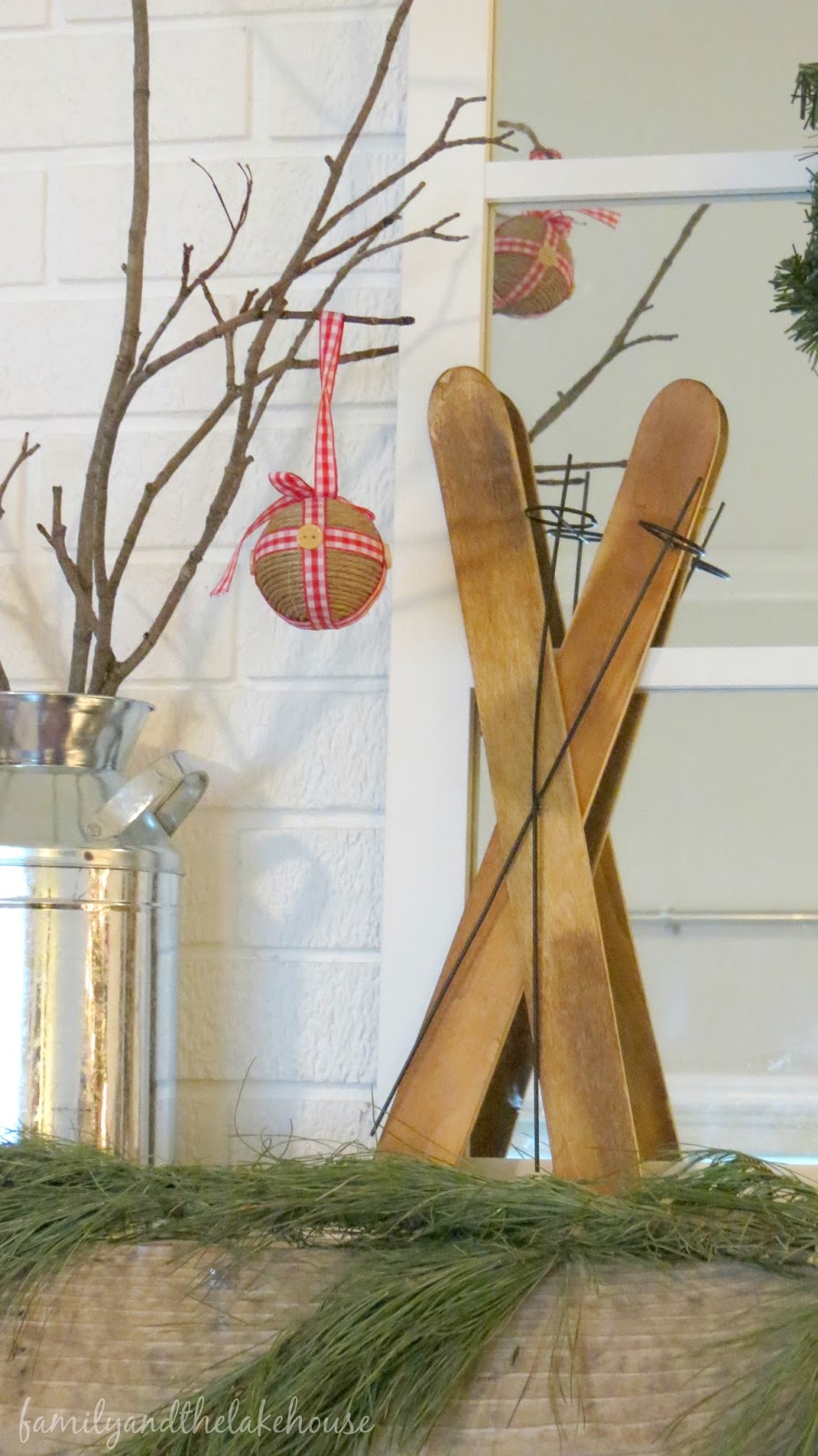 The branches are from our only tree in our front yard and the tin, cones, and the-oh-so-beloved-blog-land-skis are all from the Target dollar spot. Score!