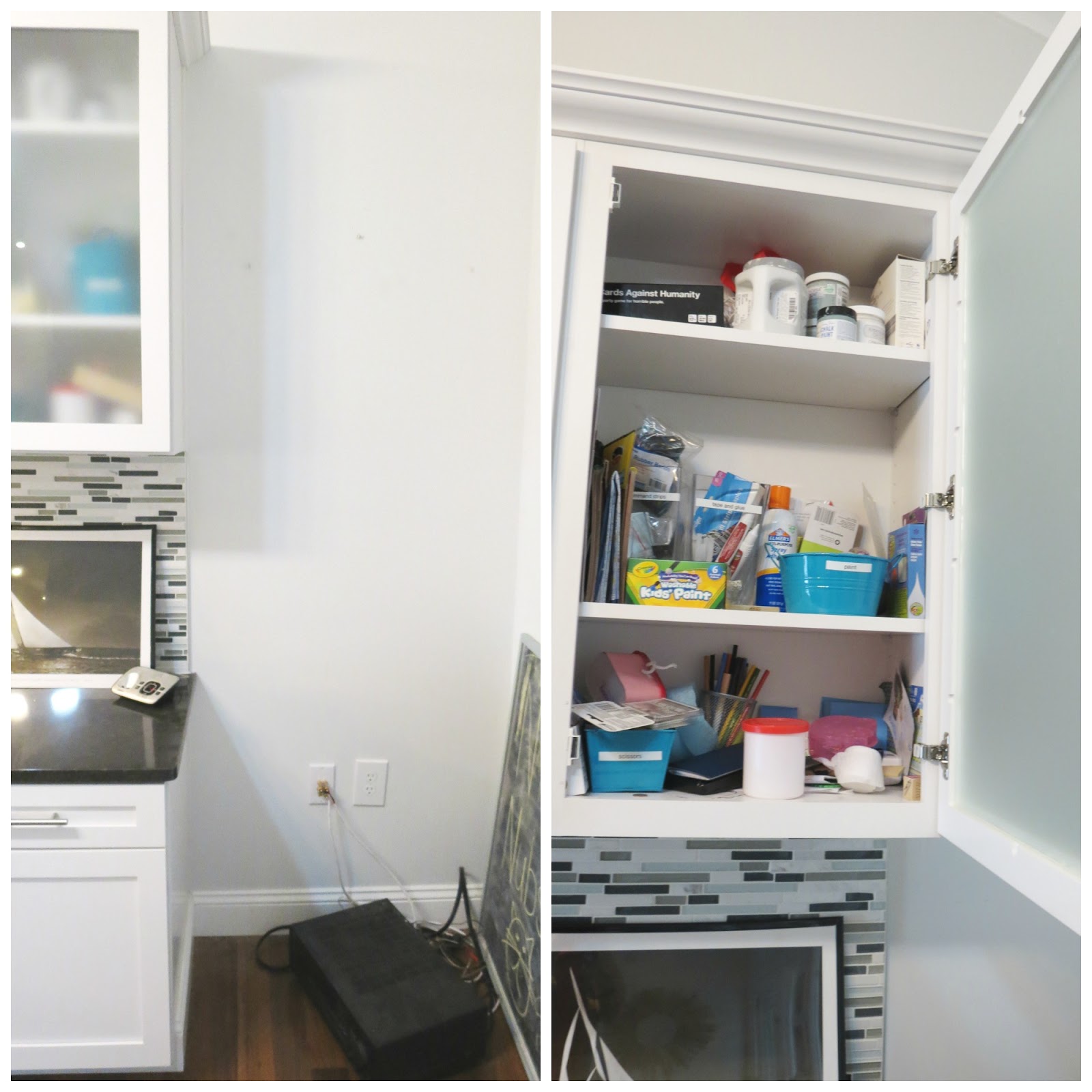 The two cabinets next to the empty space consists of tape, glue, construction paper, scissors, etc (our kitchen table is our primary crafting/coloring/gluing residence). At one point it was organized. If you look closely, you can see that I once had a date with my label maker. Long story short, it didn’t stay organized for long.